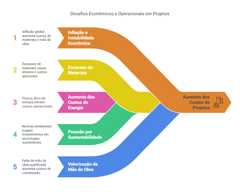 A inflação e a instabilidade econômica são fatores críticos que aumentam os custos dos projetos. O aumento generalizado dos preços de materiais, mão de obra e insumos pode elevar significativamente os orçamentos.