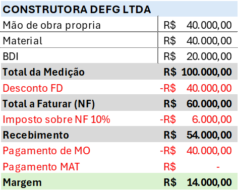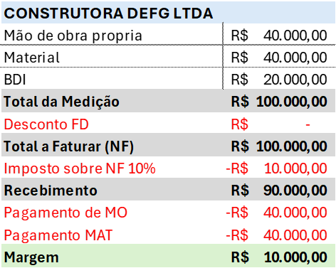 – Maior margem de lucro para a CONSTRUTORA DEFG LTDA.